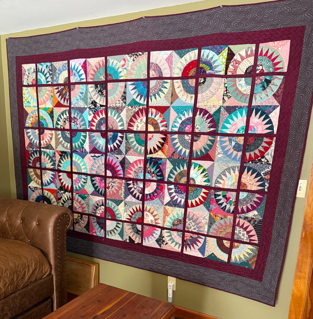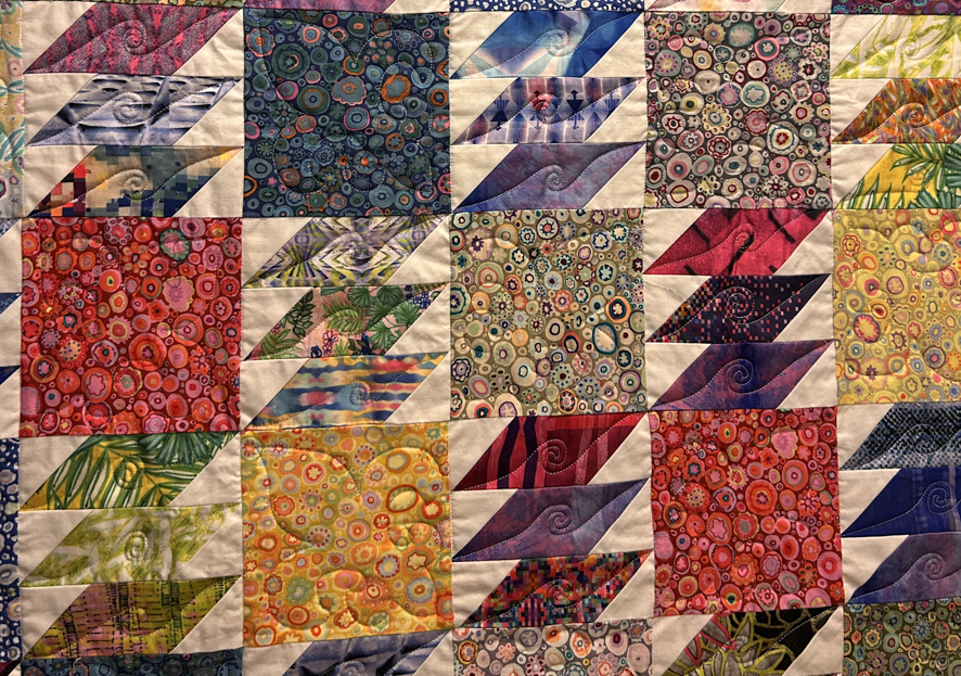 This quilt was crafted by Joann Blackmore to highlight fabric designed by my now grown daughter, Ellen Tips. The small parallelograms are Ellen’s fabrics, and Joann pulled it all together by using larger blocks of different colors, but with similar circular/floral designs. The shape and pattern repeating elements pull the whole thing together.